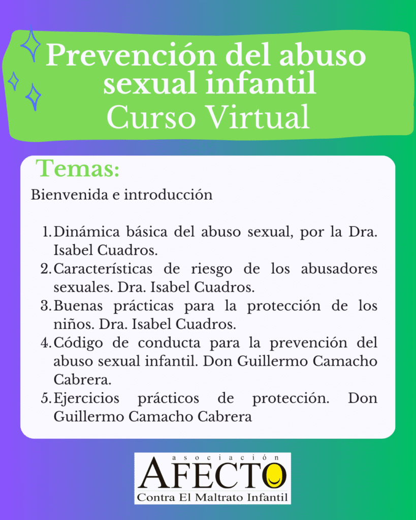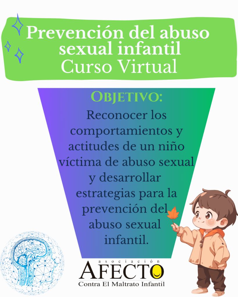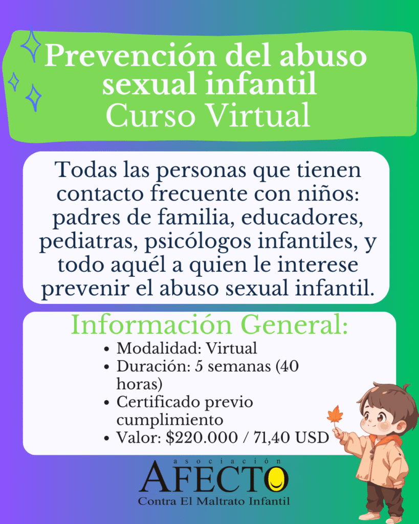 Descubre el Curso Virtual PREASI, una formación innovadora diseñada para empoderarte en la protección de niños, niñas y adolescentes. Aprenderás a identificar la dinámica del abuso sexual infantil, reconocer factores de riesgo, comprender el perfil de los abusadores y aplicar buenas prácticas de protección. El curso incluye ejercicios prácticos y un código de conducta, todo bajo la guía de expertos en el tema. Está dirigido a madres, padres, cuidadores, educadores, profesionales de la salud y del área psicosocial, así como a cualquier persona comprometida con la prevención y el bienestar infantil. ¡Conviértete en un referente de protección y marca la diferencia en tu entorno!