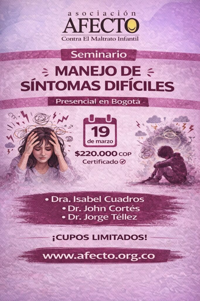 El Seminario: Manejo de Síntomas Difíciles es una jornada académica intensiva diseñada para terapeutas y profesionales de la salud mental que trabajan con niños, niñas y adolescentes enfrentando manifestaciones clínicas de alta complejidad. Este espacio ofrece una intervención interdisciplinaria, clínica y basada en evidencia, orientada a fortalecer competencias para la evaluación, comprensión e intervención en escenarios de alto riesgo emocional y conductual. El objetivo es brindar herramientas avanzadas, tanto clínicas como conceptuales, para el manejo terapéutico de síntomas difíciles en la infancia y adolescencia, desde una perspectiva integral, ética y especializada. La metodología combina exposiciones magistrales, análisis clínico y revisión de casos reales, impartidos por expertos con amplia trayectoria en salud mental, pediatría, psiquiatría y áreas forenses. Al finalizar, los participantes recibirán un certificado de participación expedido por Afecto contra el Maltrato Infantil, consolidando así su formación y preparación para afrontar con mayor solidez los casos más complejos en su práctica profesional.